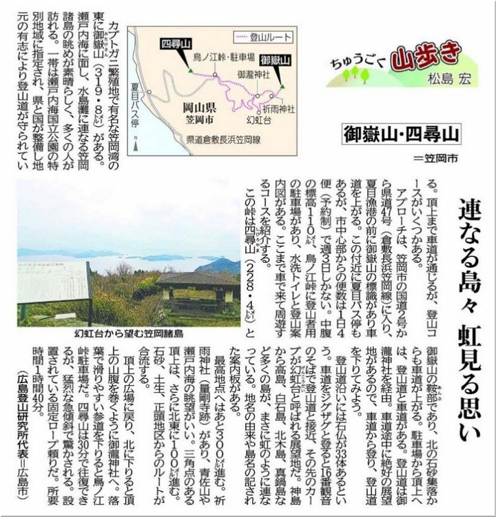 昨年の1月でしたか…中国新聞sanの「ちゅうごく山歩き」に笠岡市の御嶽山の記事掲載がありました。その際には「途中まで車で登れるのなら、いつかゴンchan連れて出掛けてみよう…」と思っておりました。