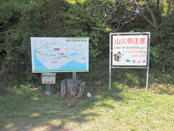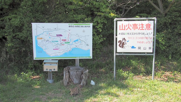 ここには、「山火事注意」と「御嶽山・四尋山 登山案内図」の表示板が。