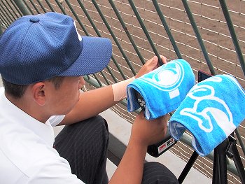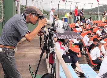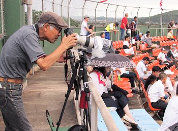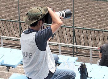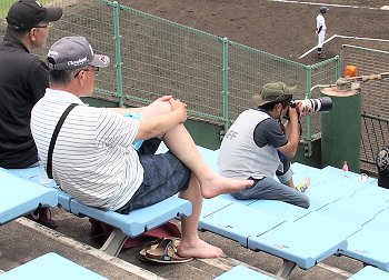 その際にバックネット裏方向に向かいますと、ここでは盈進高校の生徒さんなのでしょうか…試合の様子を映像に納めながら、同時にスピードガンで球速を計測です(^.-)☆