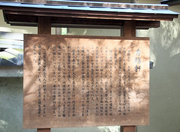 秀路軒は、天明の大火(1788年3月7日)で焼失した表千家の残月亭、不審菴およびその路地を、古図を基に中村昌生氏の設計により再現された茶席である。