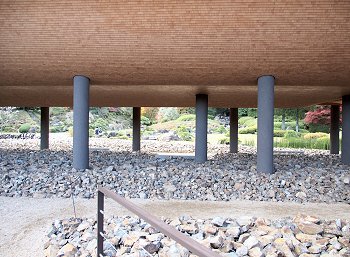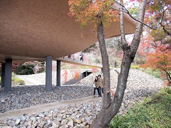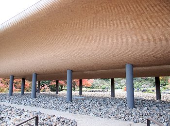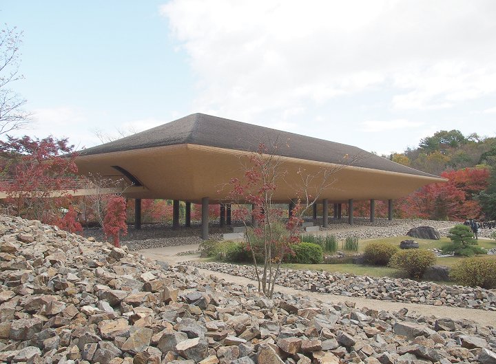 禅寺である神勝寺の境内に建つアートパビリオン「洸庭」。伝統的なこけら葺きを応用し、全体を木材で柔らかく包んだ舟型の建物が、石のランドスケープの上に浮かぶ。