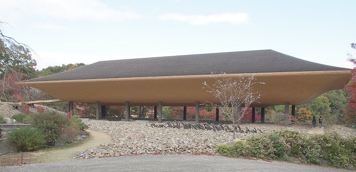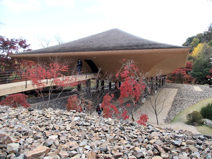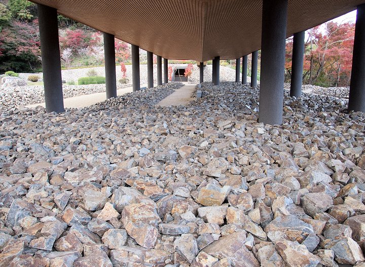 ゴツゴツとした大きな石が敷き詰められた上には、鉄柱で支えられた、なだらかな曲面からなるこけら葺ぶきの巨大な建物が、浮遊しているかのように建っています。小さな扉から中に入ると、そこにはただただ暗闇が広がっており、感覚を研ぎ澄ませ、ようやく暗さに順応できた頃、目の前でかすかにゆらめく水面を感じることができます。