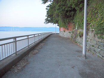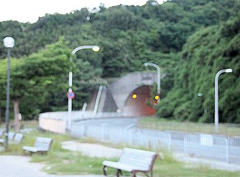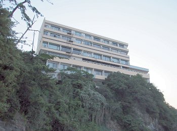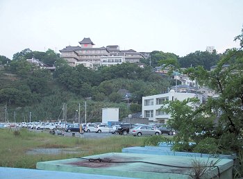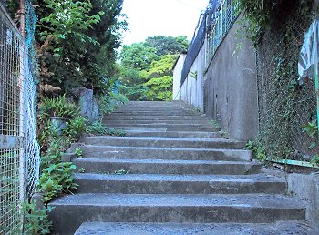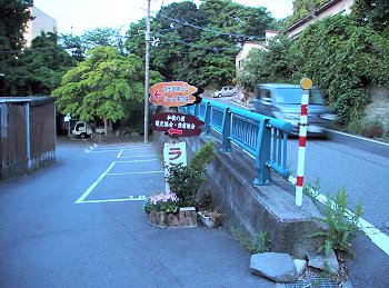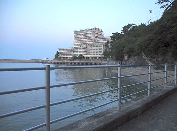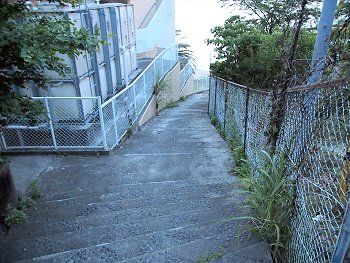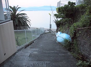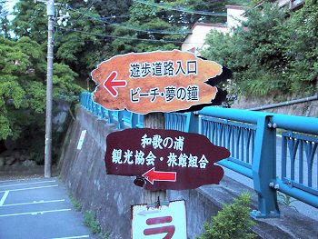 フロントで教えて頂きました散策コースは、ホテル前の坂を下り、ガードレールの切れる辺りで右に折れ海岸にと下りて行く…との事でしたが、その通りに坂を下って行きますと、ガードレールの切れる所に『遊歩道路入口 ビーチ・夢の鐘』の表示板。