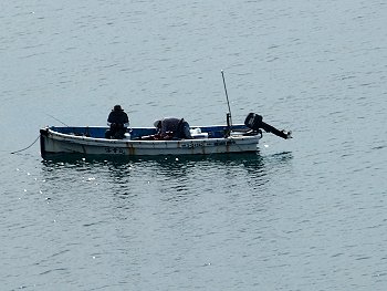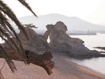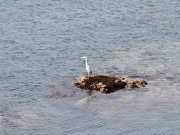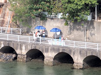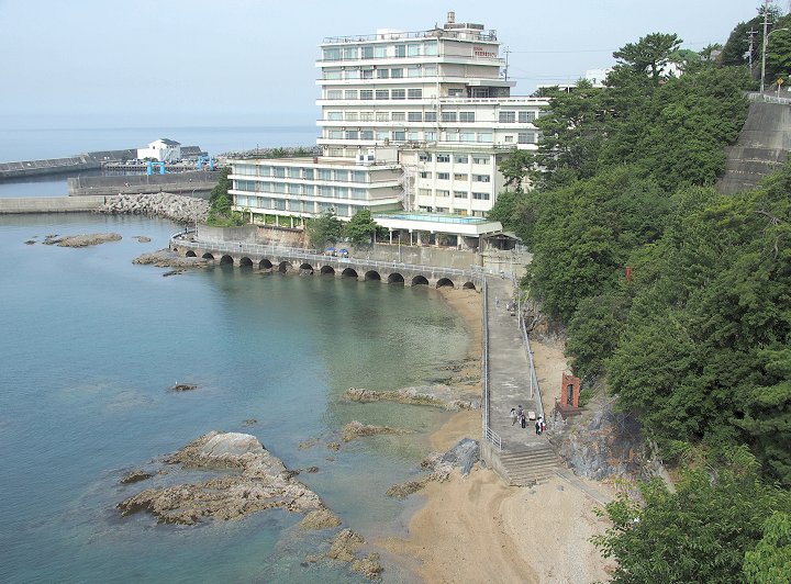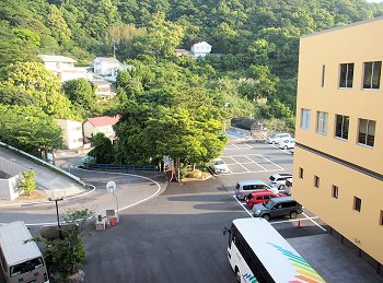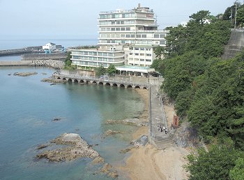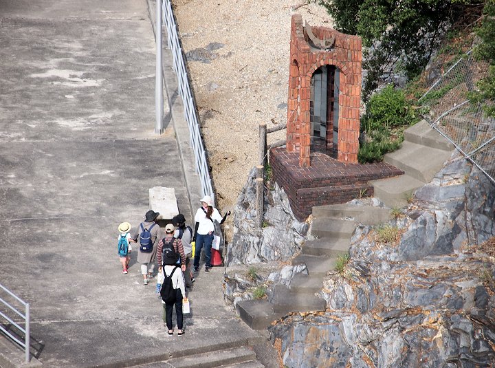 ロビーから、つぃ先ほど歩いておりました海岸沿いの散策道を見下ろしますと、『夢の鐘』の前にご家族連れが…