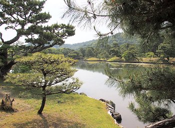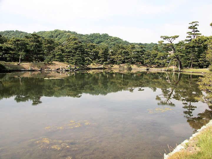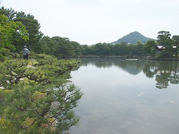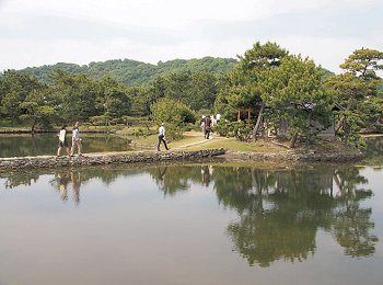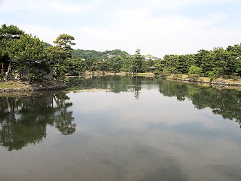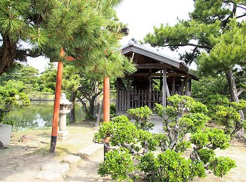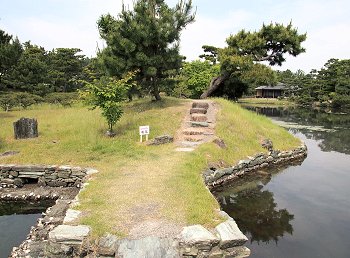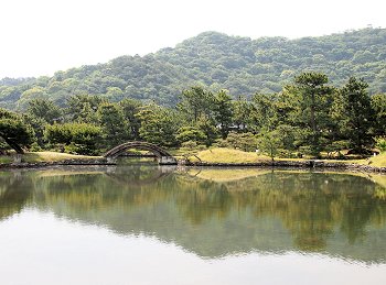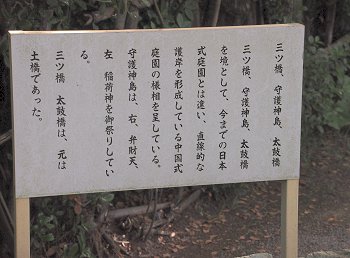 和歌山湾沿いの立地を利用して、海水を引き込んだ「汐入り」の池が特徴的で、潮の干満に応じて細波が立ち、水面が上下する独特の風情がある。この池には、日本庭園としては珍しい直線状の三ツ橋を渡しており、背後の天神山と章魚頭姿山(たこずしやま)を借景としたこの構図は、中国の西湖を模したものと伝えられている。