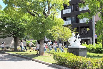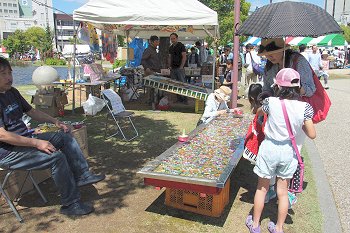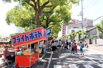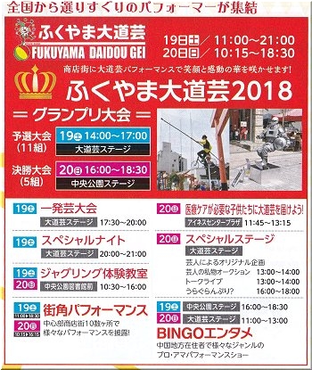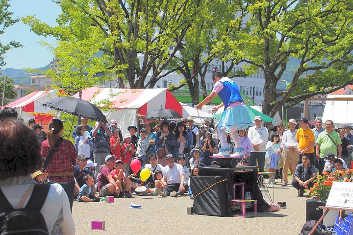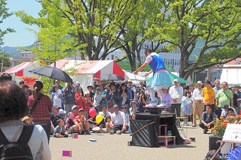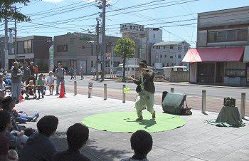 毎回楽しめますのが、全国から選りすぐりのパフォーマーが集結の『ふくやま大道芸』。2日目はA.M.10:15からのスタートですから、霞町商店街の一角でも中央公園入口近くでも、パフォーマーの皆様は開始前の準備でお忙しそうでしたネ(^-^)