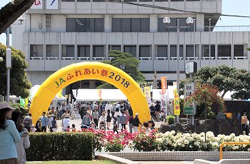歩道橋を渡ります際にJA福山を見下ろしますと、ここも『JAふれあい祭2018』が賑やかに開催されておりました。ステージのこの男性は、どなたでしたのでしょうねぇ〜