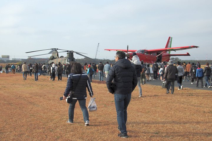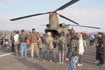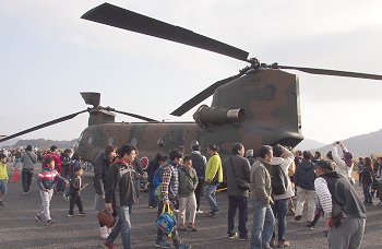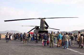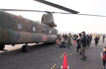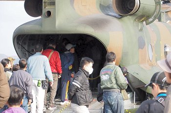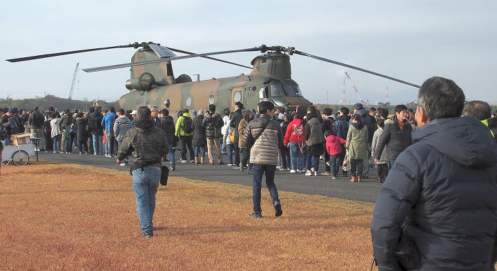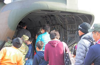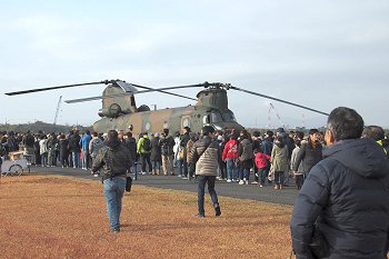 この長蛇の列は何だろう?…と思いましたら、ふ〜ん、大型輸送ヘリの中に入ります順番待ちのようですネ(^.-)☆