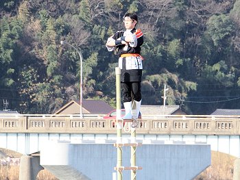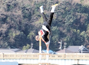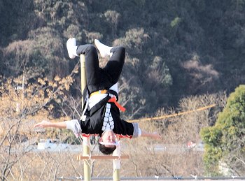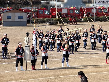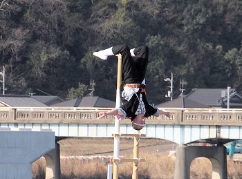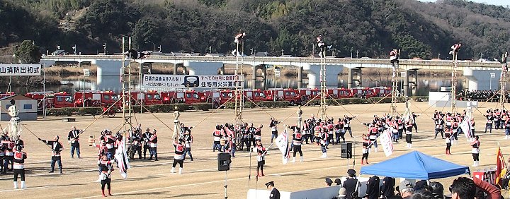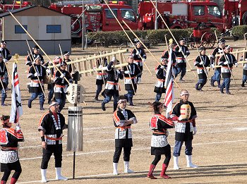 消防音楽隊のマーチングが終わりますと、次は木遣(はしご乗り)と続きます。