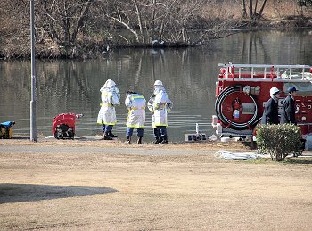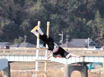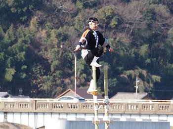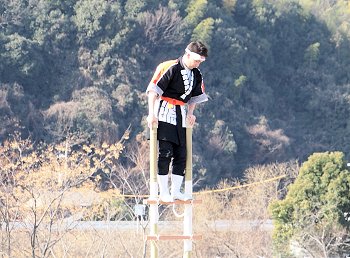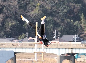 見物者として見ておりますと、そんなに高いハシゴとも思わないのですけど、実際にハシゴの先っぽまで上がり下を見ますと、随分高く感じます事でしょうねぇ〜