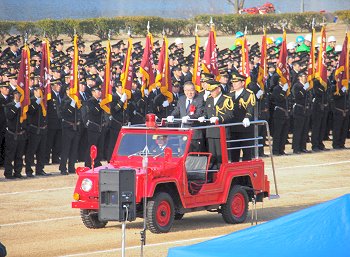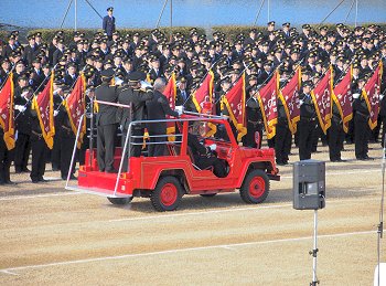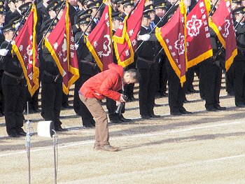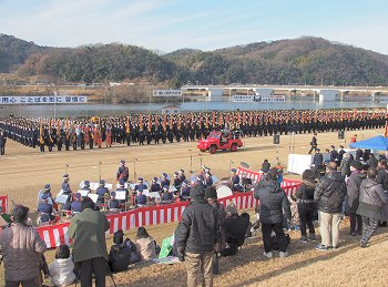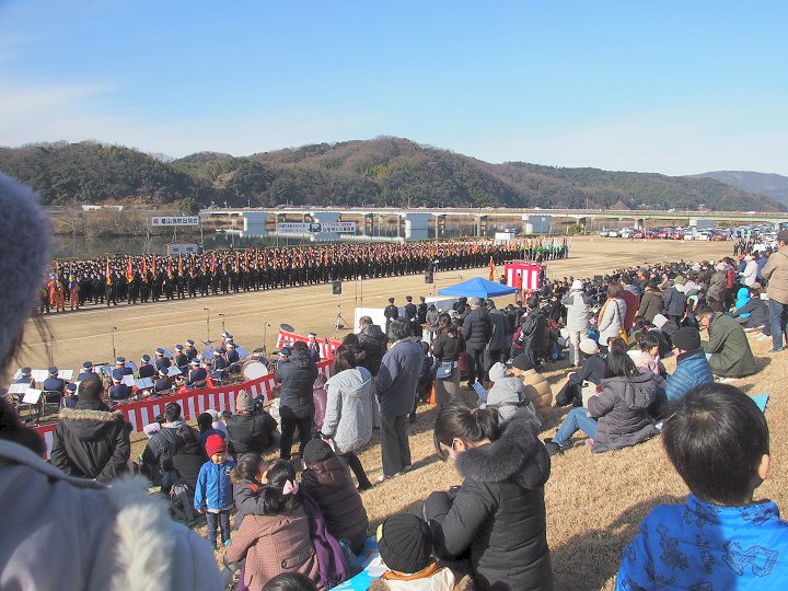 福山市長の消防部隊観閲、国旗掲揚、黙とう、式辞、消防功労者表彰、永年勤続功労表彰、来賓祝辞…と続きますけど、この間は消防団員の皆様はズッと立ちっ放しですから大変と言えば大変ですネ(^-^)