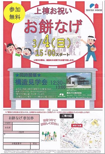 何だろう?…と拝見しますと、我が家近くの新築現場の「構造見学会」と「上棟お祝いお餅投げ」のご案内でありました(^_^)v