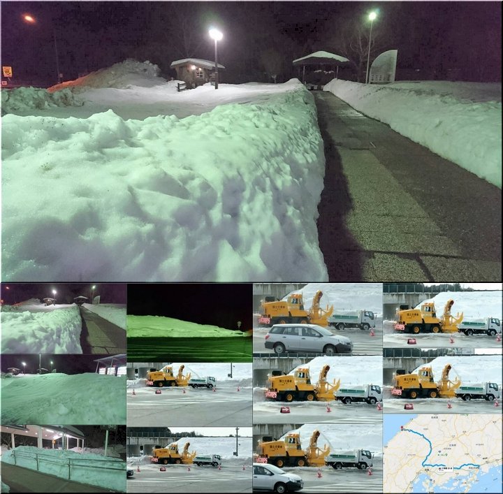 勝手に想像しますと、山陰に向かいます途中の一コマと、益田か江津市内での国交省によります除雪作業の一コマのようですネ。
