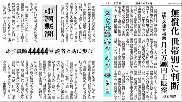 中国新聞は20日の朝刊で、発行号数が第44444号を迎える。新聞用語で紙齢と呼ばれ、前身の「中國」として創刊した1892(明治25)年5月5日の第1号から積み上げてきた。第33333号だった1986(昭和61)年11月27日以来、31年余りかけて再び5桁の数をそろえた。