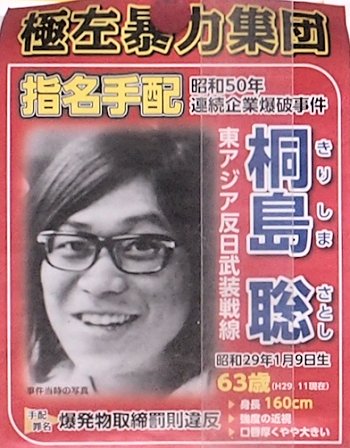 その右側には指名手配犯のポスターです。「昭和50年、連続企業爆破事件」犯の指名手配ですけど、昭和50年と言いますと既に43年も昔の事件。そぅ言えば、こんな事件がありましたねぇ〜この犯人は未だに逃亡を続けていますのですネ。GONsanが25〜6の時の事件ですよ。ふ〜ん、そぅなんですか…