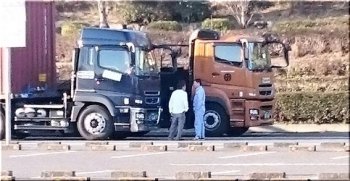 茶色っぽいトレーラが先行で、黒っぽいトレーラが後続で走行中、後続車が蛇行し、煽り運転をしましたとか…