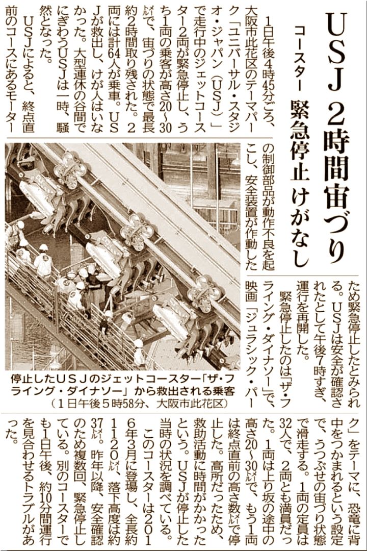 そぅ言えば本日の朝刊に、このUSJのジェットコースター宙づり事故の件が…