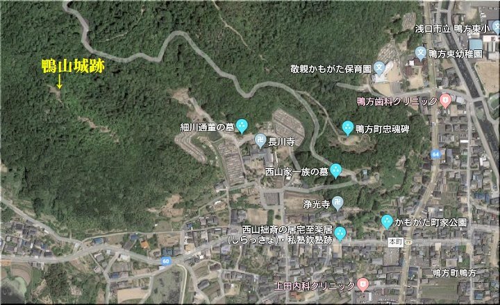 鴨山城は長川寺の北西に聳える標高168.2mの山頂に築かれている。