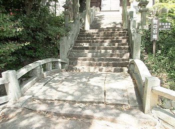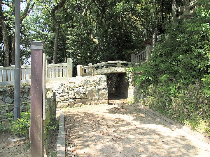 鴨神社の随身門下にある石橋で、「鴨方に過ぎたるものが三つある。拙斎・索我・宮の石橋」と謡われた鴨方三奇一つです。長い板状の石6枚を反らせて整えた太鼓橋で、鴨方の町筋からの参道を上ってくる参拝者のために造られたものとのことです。石橋が跨ぐ小道付近の小字名が「鴨之下通」であることから、この小道がかつての古道であり、本来の参拝口はこの石橋辺りにあったことを思わせます。かもがた町家公園の北西側にあります。