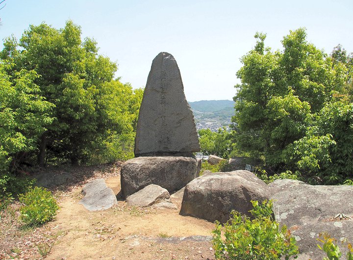 「城郭に昭和11年(1936)、道董350回忌に家臣の後裔有志によって建立された城址碑」。揮毫は原田一道の孫、元西園寺公望の秘書官原田熊男の筆による。