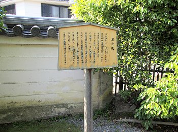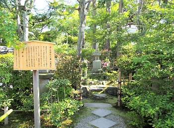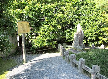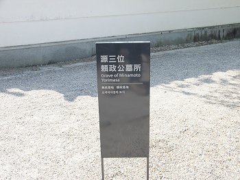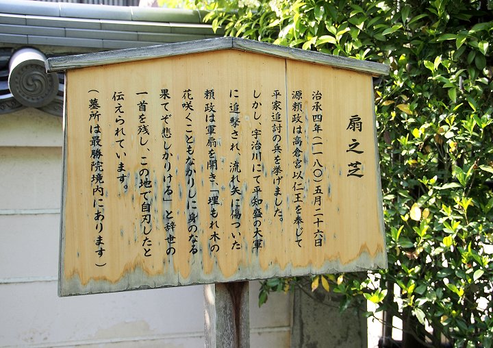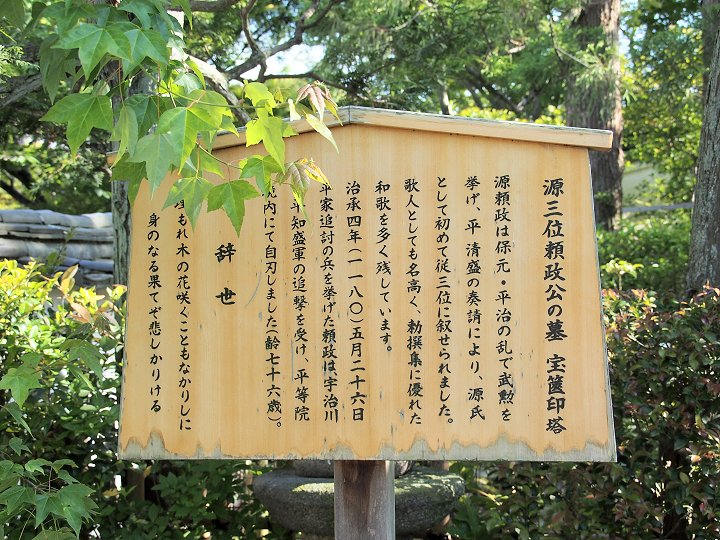 そばには、源三位頼政(げんざんみよりまさ)の墓と書かれた看板があり、「平清盛の横暴に憤り高倉宮以仁王の令旨(りょうじ)を奉じ平家打倒の義兵を挙ぐ」と記述されています。