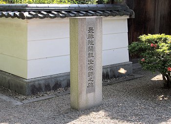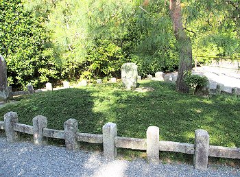 頼政公最期の地とお墓は宇治平等院内に今も残っています。平等院の表門拝観受付入ってすぐ左側に小さな道があります。その奥、観音堂の横に緑の一角が。