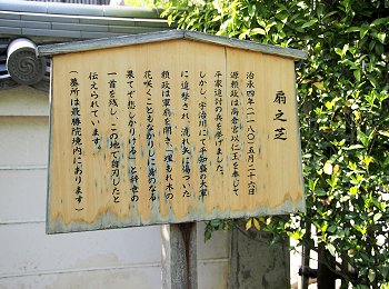 上の歌は、頼政が詠んだ辞世の一首と伝えられています。そして、頼政が自害した場所とされる芝生が平等院の境内に残っています。そこは、「扇之芝」と呼ばれています。