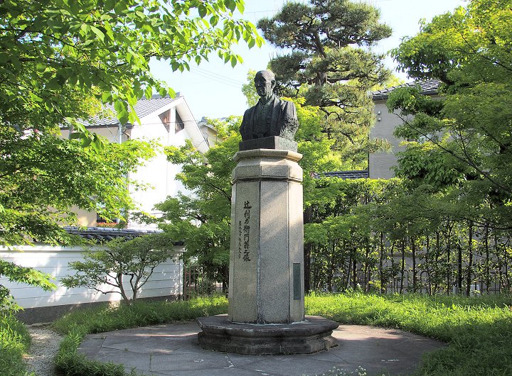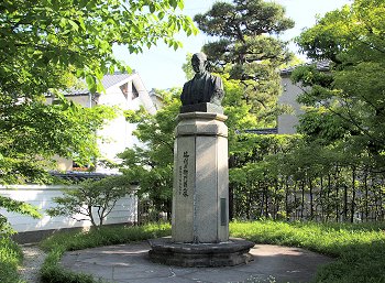 辻利右衛門像(つじりえもんぞう)、宇治茶の老舗「辻利」の創業者。玉露製法の確立と茶櫃の考案により宇治茶の復興に大きく貢献した。その功績により緑綬褒章を受賞、平等院正門横に銅像が建立された。