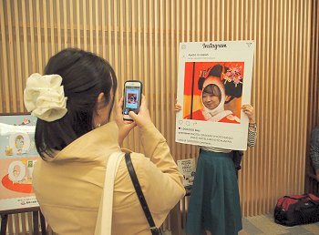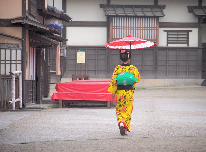 降雨の中、映画村内を散策しておりますと、前方に着物姿の女性が…