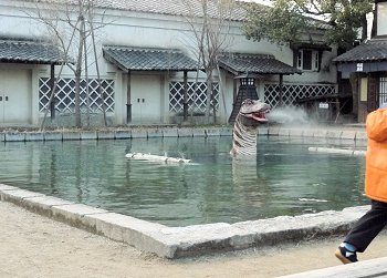 たった今、何かアトラクションが終わりましたようですネ…プール脇には「特撮プール」の案内表示板が…