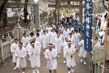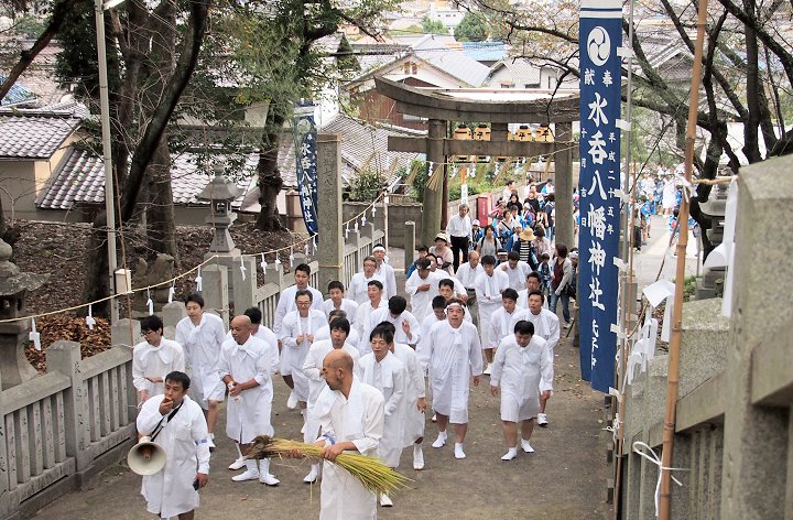 この方達が石段を境内にと駆け上がりますと、下には既に平木・山之神地区の皆様が鳥居の前で待機中。