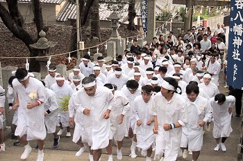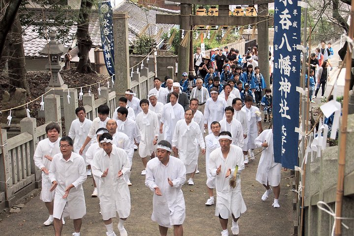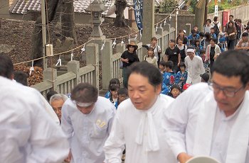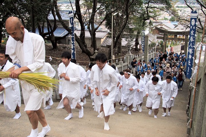 土井・浜地区の皆様が神殿前に整列、そしてお祓いを受けますと、平木・山之神地区の皆様が石段を駆け上がり境内に(^-^)