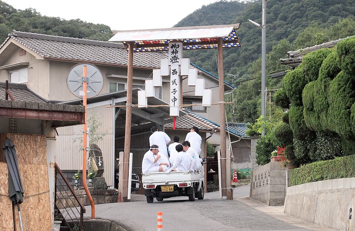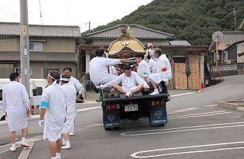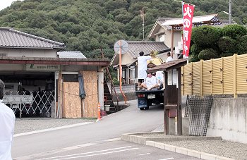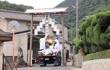 トラックに積まれました御神輿は八幡神社下を抜け六方学園へ…ですが、御神輿の上部が御神燈をくぐりますのに一苦労(^-^)