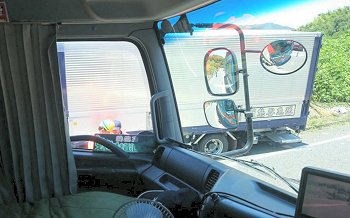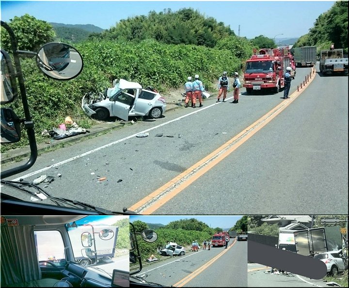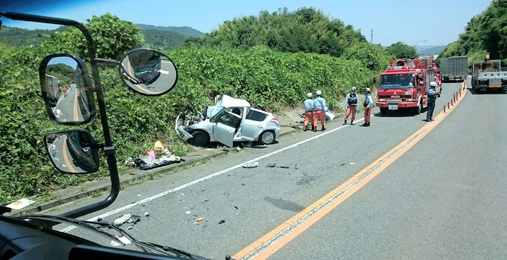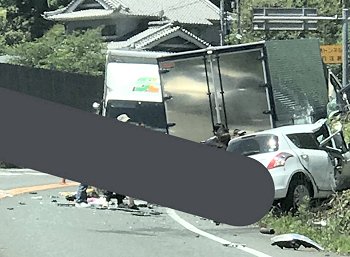 画像を拝見しますと、赤坂バイパス上り線側の路傍に、4tウィング車と普通乗用車が、いずれも下り方向を向いて乗用車は大破。