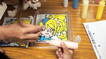 下絵にそって絵の具を流し込みながらの作成で、拝見していますと易しそうに見えるのですけど、当の本人達には意外と難しい様子。下絵から絵の具がはみ出ますと、つま楊枝を使用して修正ですけど、それが仲々思うようには…