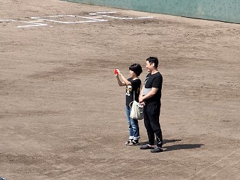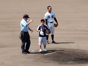 ふ〜ん、応募し当選された小学生なのでしょうか…始球式に登場です。その様子をカメラで追いながら不安そうに見守りますご両親。