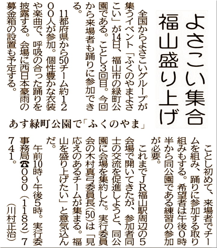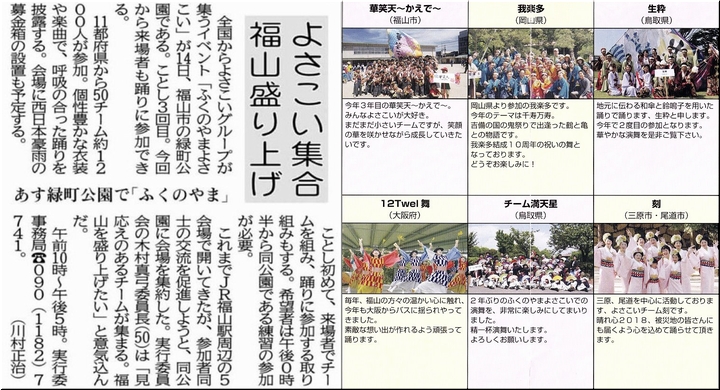 「よさこい集合 福山盛り上げ」…こんな中国新聞sanの朝刊記事に誘われて、10/14(日)には「第3回ふくのやまよさこい」を楽しむ事となりました(^.-)☆