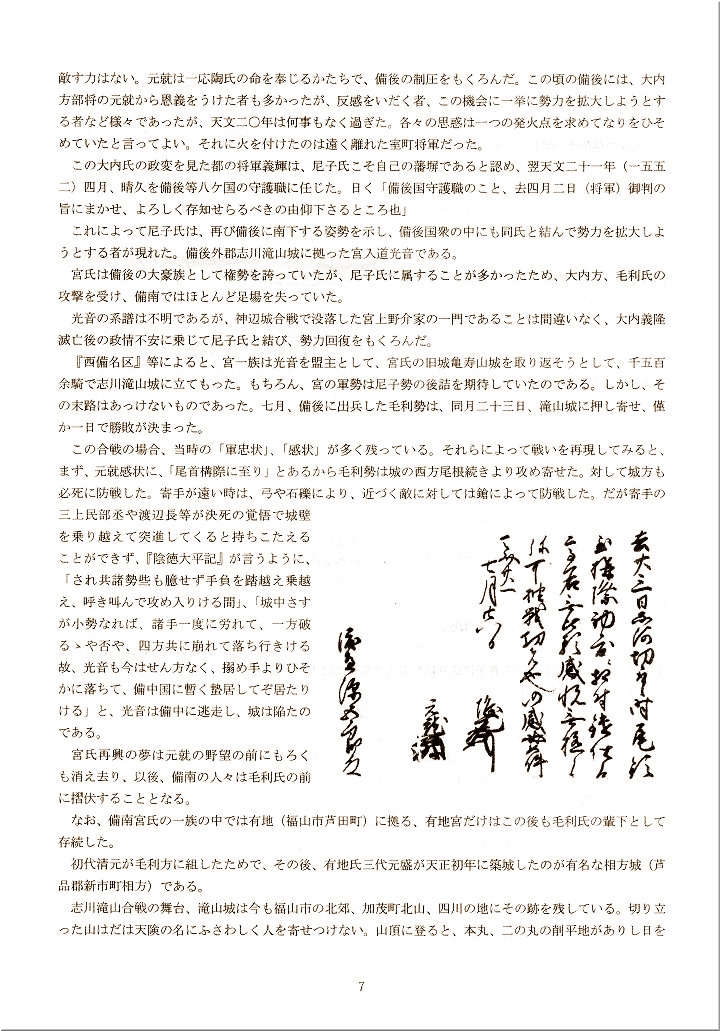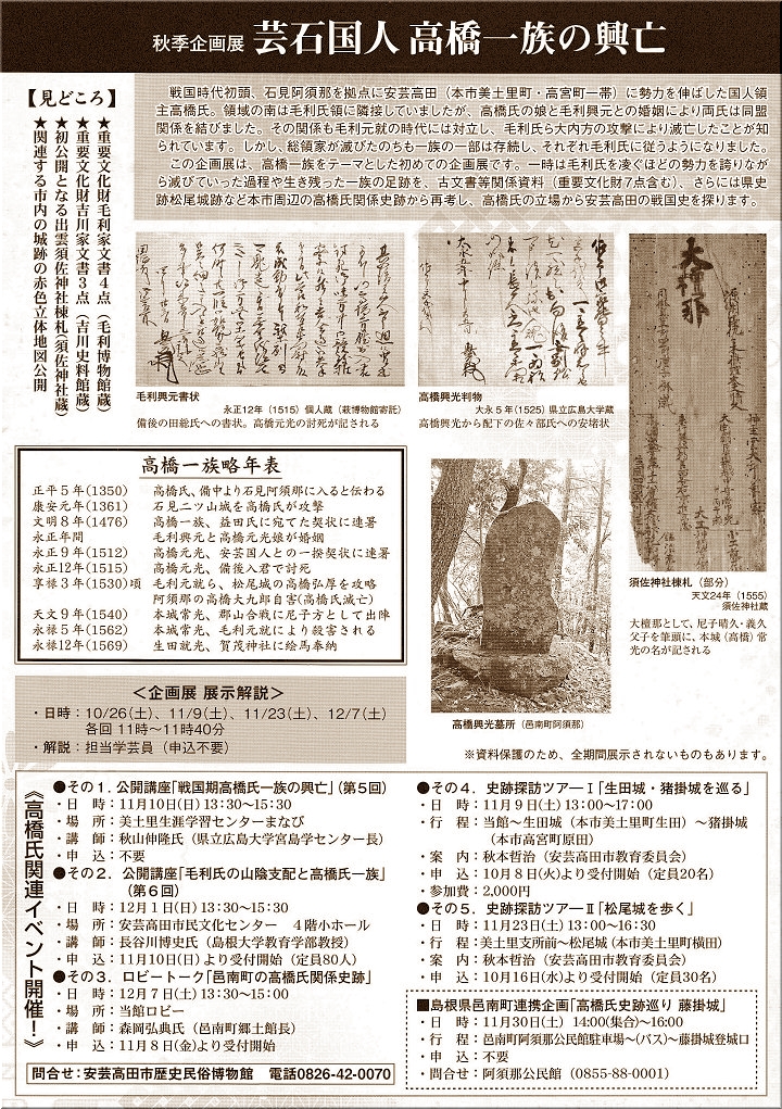 毛利氏とその本拠地であった郡山城を中心に、安芸高田市の歴史や文化財を紹介する博物館である。毛利元就にまつわる古文書や郡山城からの出土品、毛利氏による社寺への奉納品などを展示。常設展の他にも様々な企画展示が行われている。