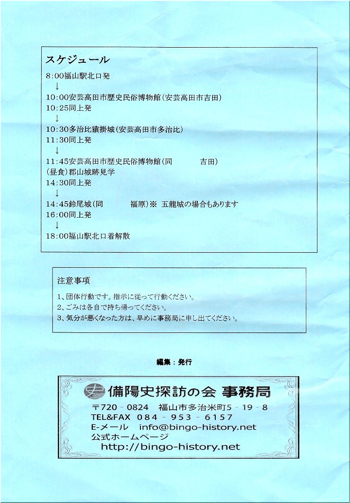 バス車内では、資料を基に事前学習。この日の講師を務められました備陽史探訪の会・田口義之会長より、丁寧なご説明がありました(^.-)☆