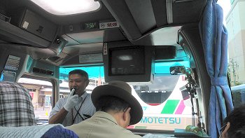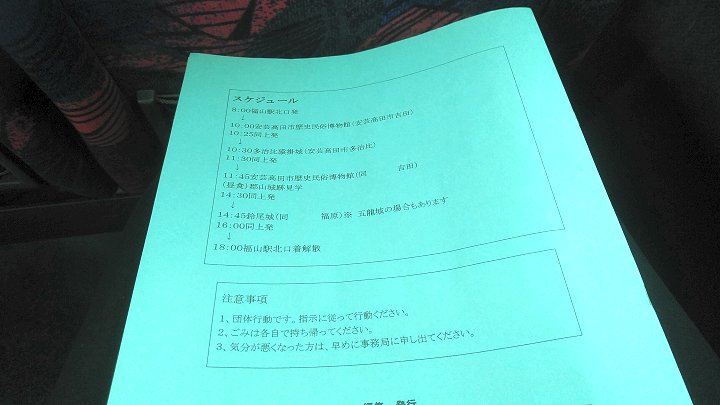 当日は、A.M.8:30に、福山駅北口観光バス乗り場に集合です。GONsanは申し込みが遅れまして、申し込みしました時には定員に達しておりまして、補助席での参加となりましたけど、欠席者がおられましたのでしょうか…幸いにも補助席ではありませんで正規の座席。ラッキーでしたネ\(^o^)/