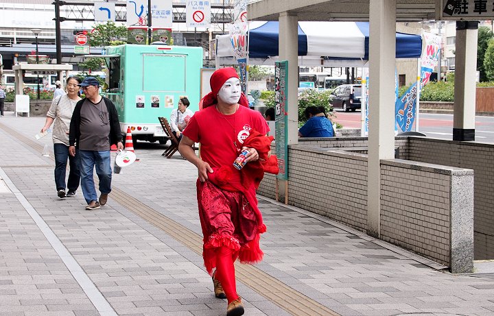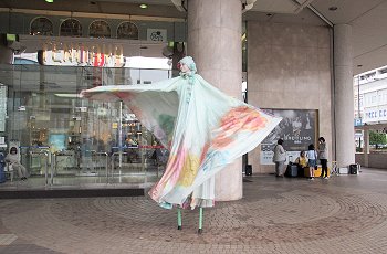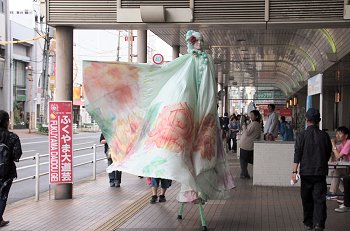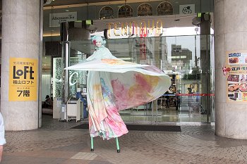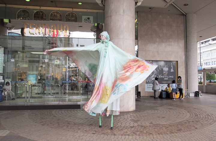 天満屋福山店前の信号を渡りますと、タイミング良く足長パフォーマーがヤッて来られまして、信号待ちの時間を利用され、暫しダンスのご披露です(^.-)☆