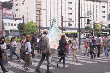 これはスタチュー(銅像)と呼ばれる芸である。日本ではそれほど見かけないが、ヨーロッパでは名だたる観光地では大抵見かける。街の目抜き通りの真ん中に像が立っているかと思ったら、どうもおかしい、近づくと生身の人間が仮装をしている。投げ銭が入ると、それにあわせて一定の動きを見せてくれる。