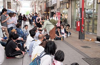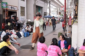 足長パフォーマーとお別れし、天満屋横から久松通りに向かおうとしますと、色んなパフォーマーの皆様の大道芸で、大変な賑わい。