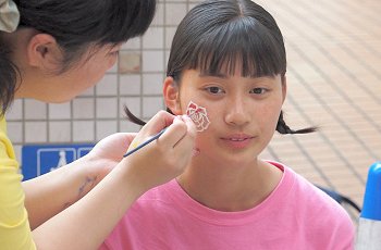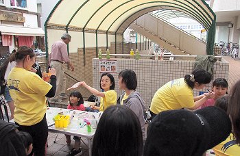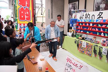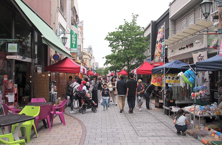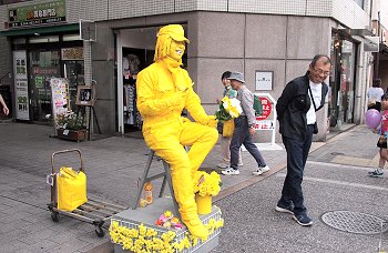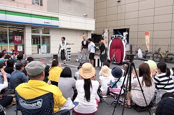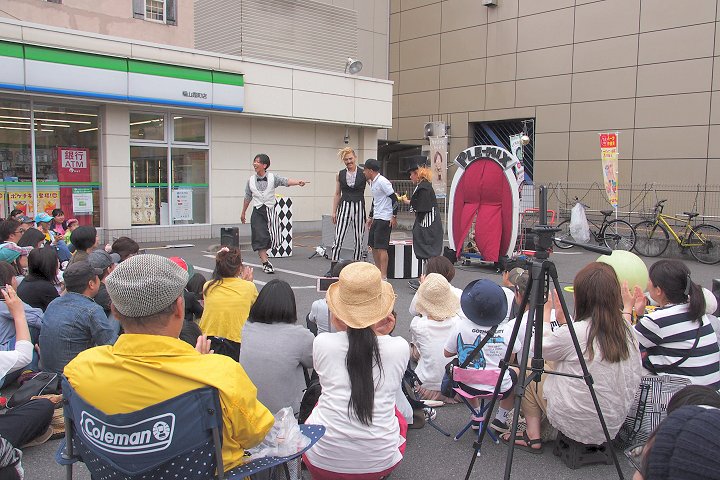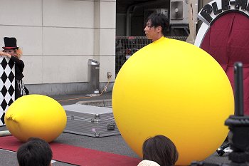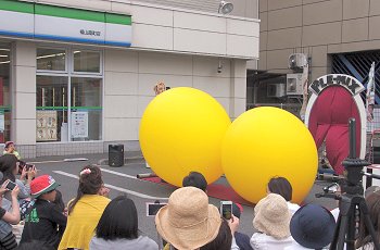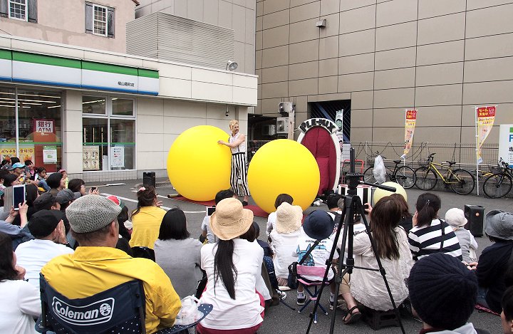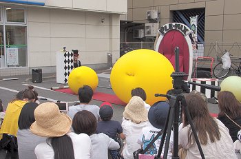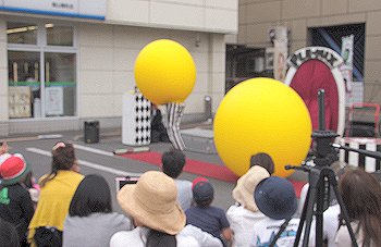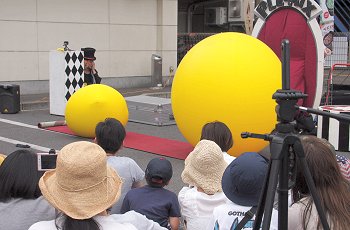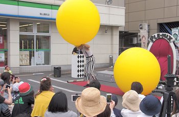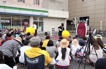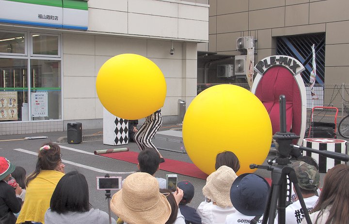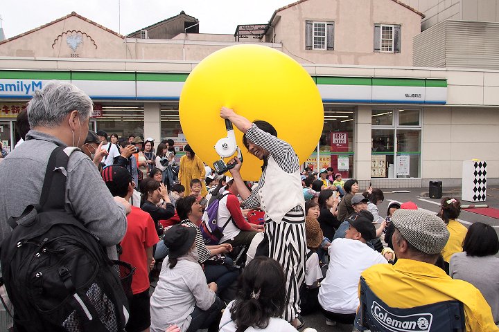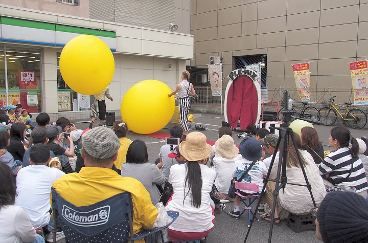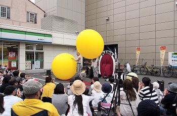 久松通りを中央公園に向かって国道2号線を渡りますと、ファミリーマートsanの駐車場では、大きな黄色い風船を使用しました大道芸が…