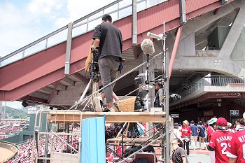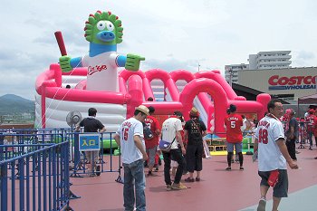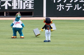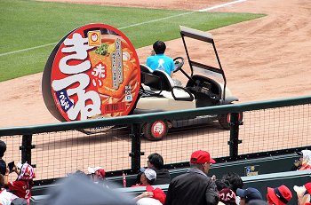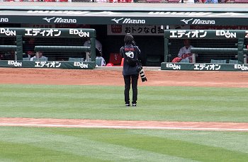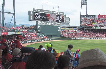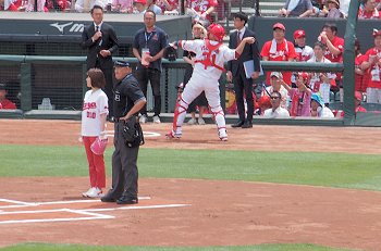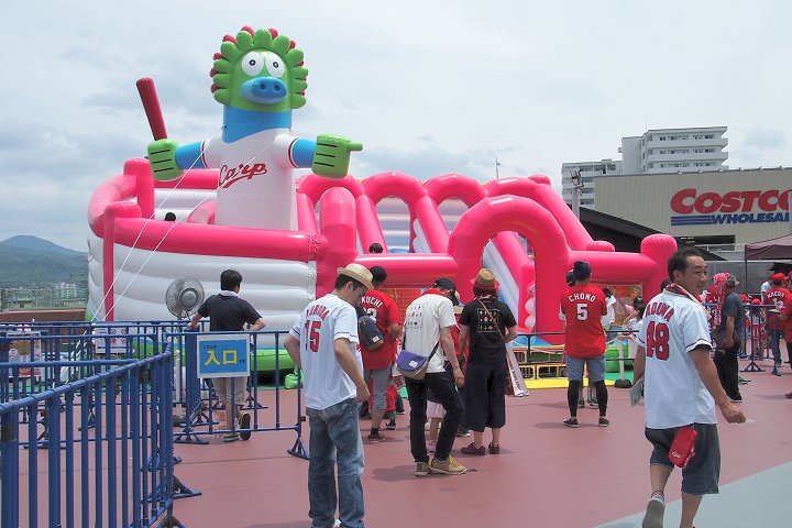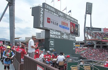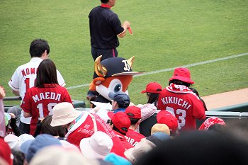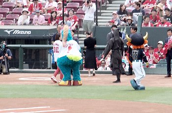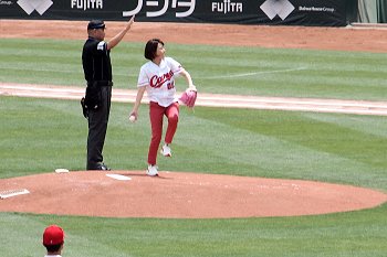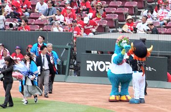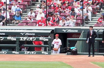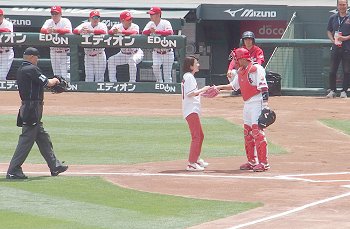 試合開始も近づいて来ましたが、この日の始球式には、NHKでお馴染みの気象予報士「勝丸恭子」san。もぅすっかり広島県内(中国地方と言った方が良いのかも)では有名人の勝丸さん。