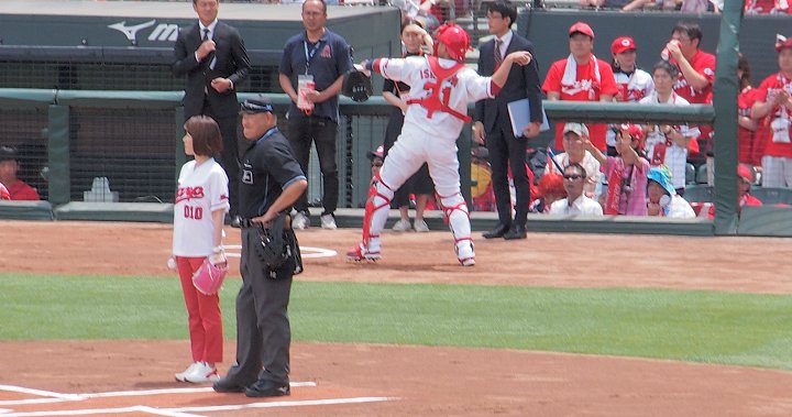 6月23日(日)対オリックス戦の試合前に行なわれた始球式は、広島県出身で、NHK広島放送局「お好みワイドひろしま」などに出演されている 気象予報士 勝丸 恭子 さん に務めていただきました。