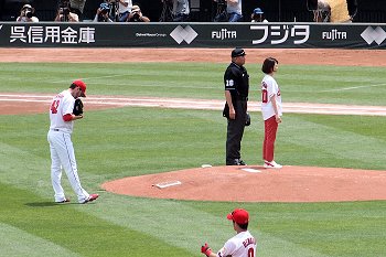 小園選手とキャッチボールで肩を慣らしたあとマウンドへ。