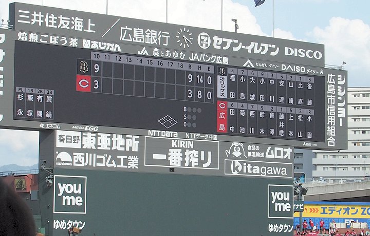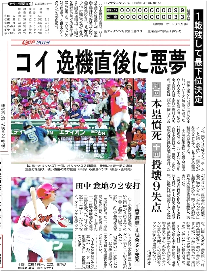 反撃もここまで。結局、「9×3」で敗戦となりました広島カープ。う〜ん、残念(^-^;