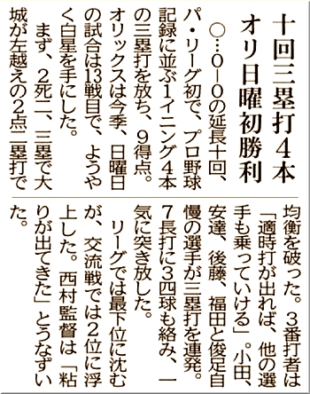 10回表のオリックスの猛攻では4本の三塁打が出ましたけど、これはプロ野球タイ記録でしたようですネ。
