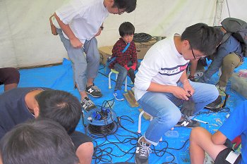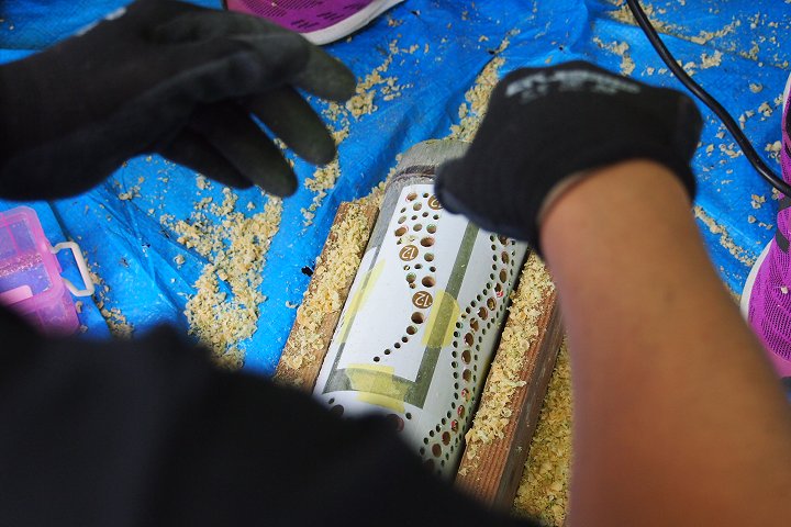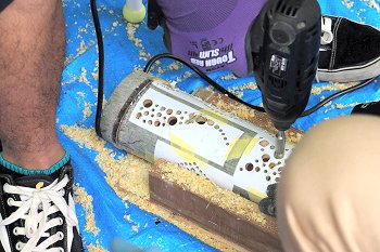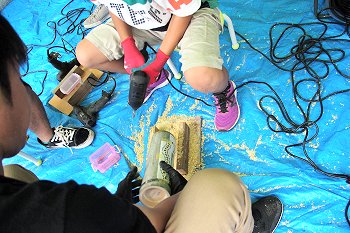 電気ドリルを手にチビッコ達が、楽しそうに懸命に穴あけ作業を(^-^)